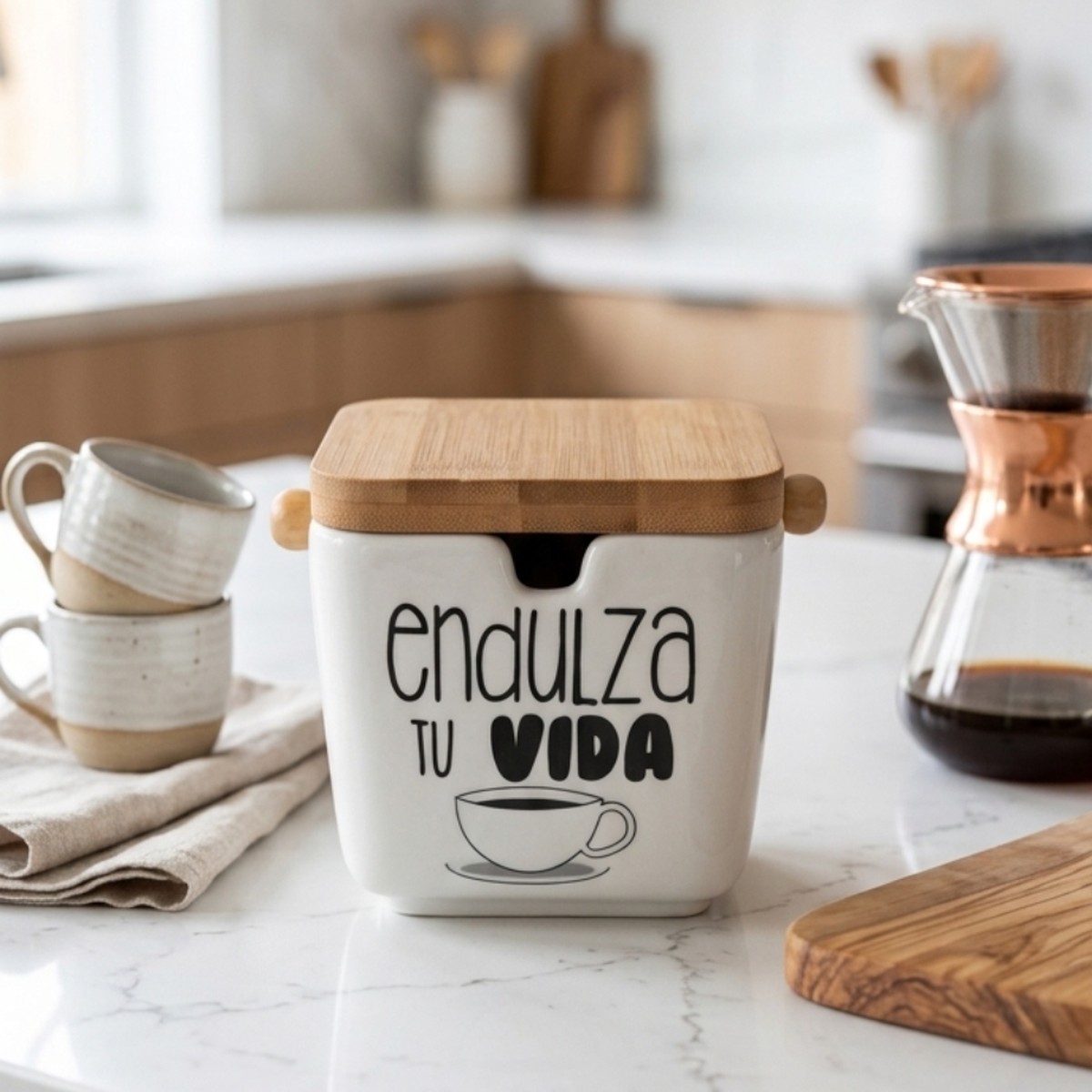 Azucarero de cerámica con tapa de madera y mensaje decorativo. Ideal para mantener el azúcar y dar estilo a tu cocina.