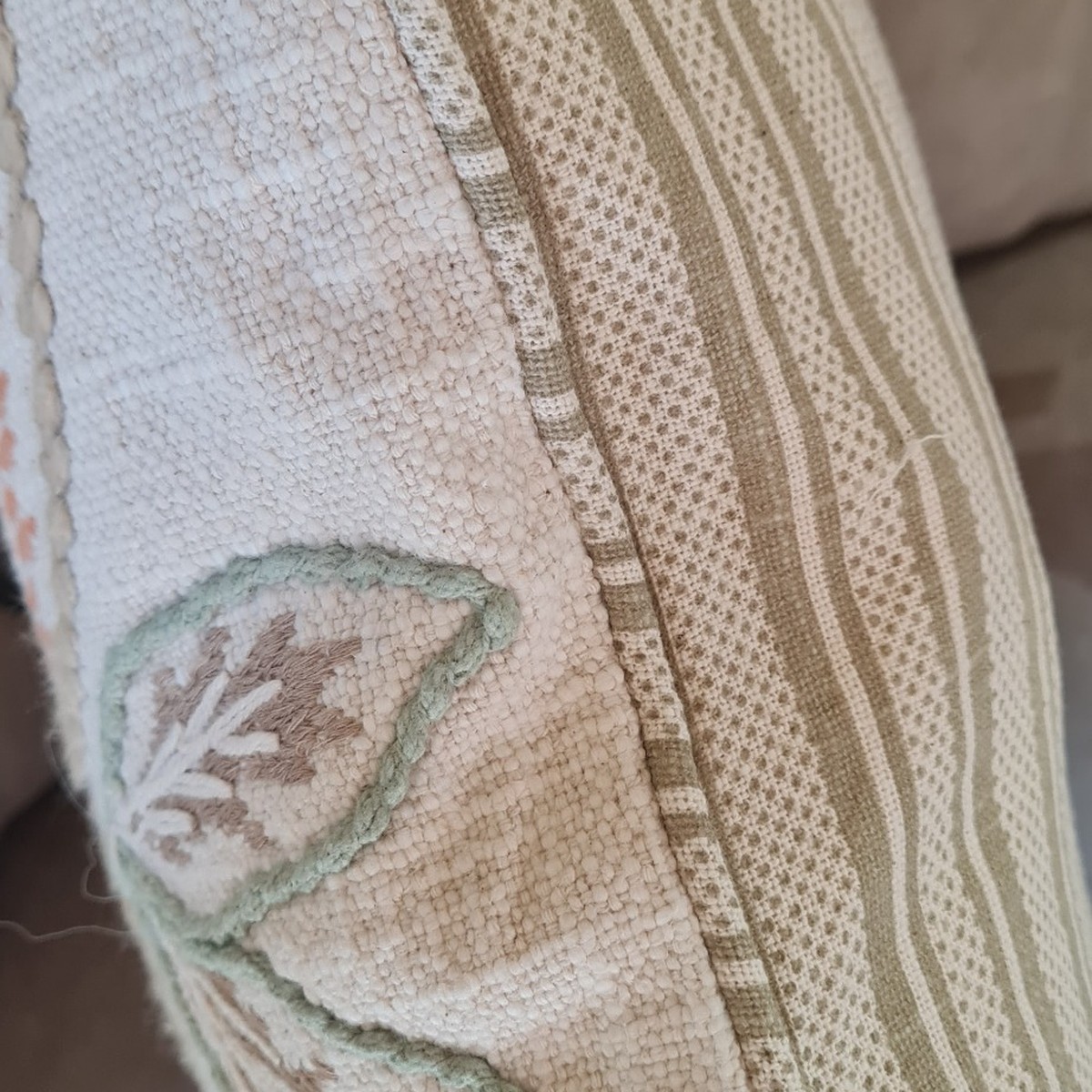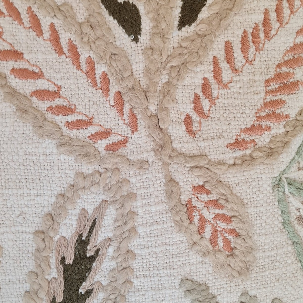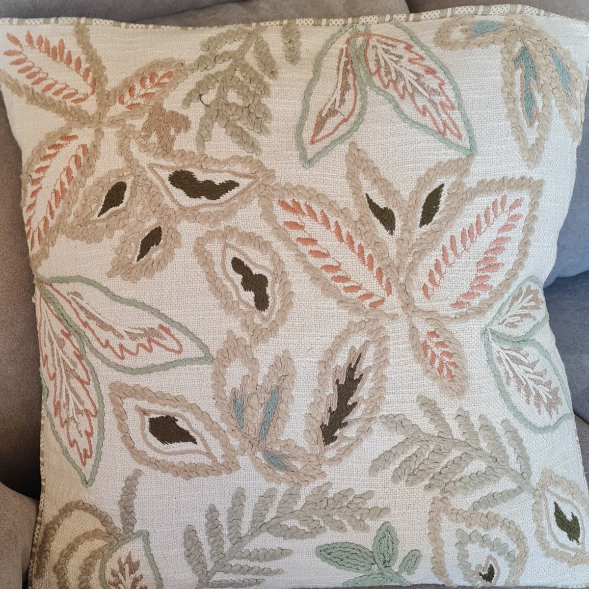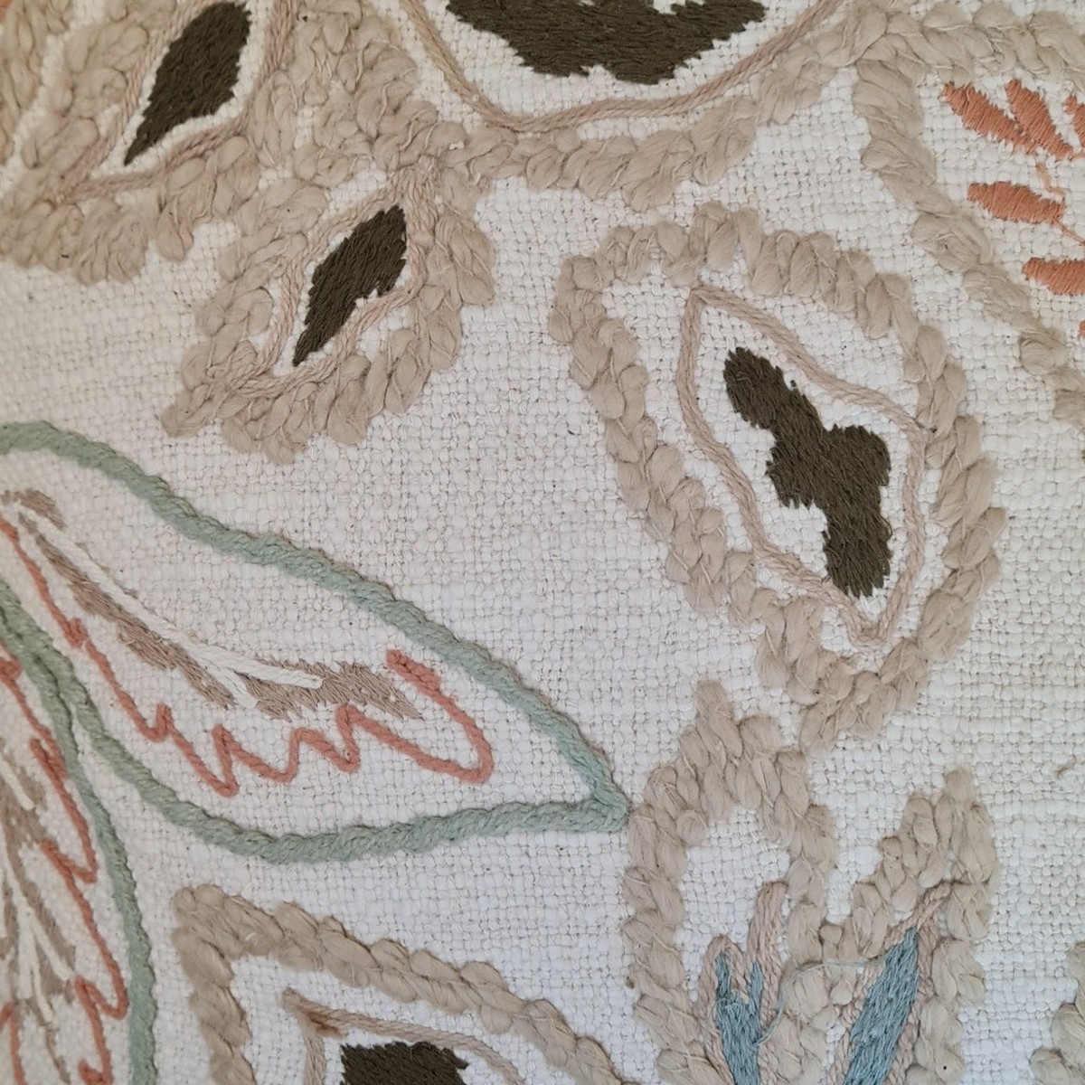 Cojín decorativo bordado con diseño floral y motivos naturales en tonos beige, verde y terracota. Ideal para aportar textura y calidez a sofás, sillones o camas en decoraciones de estilo natural, boho o mediterráneo.
