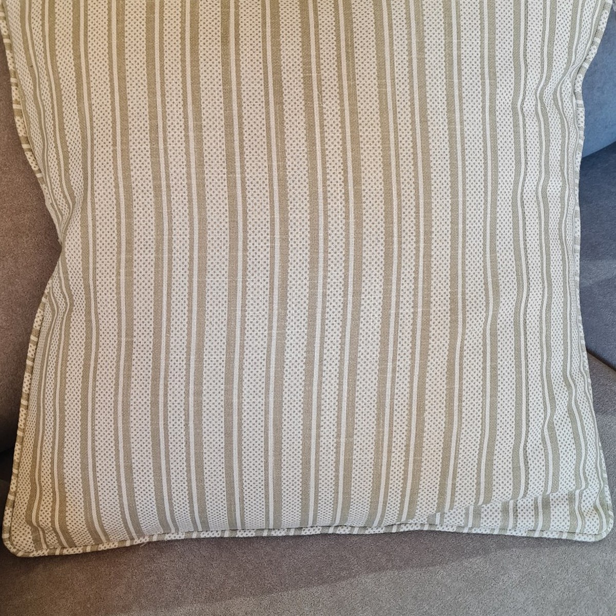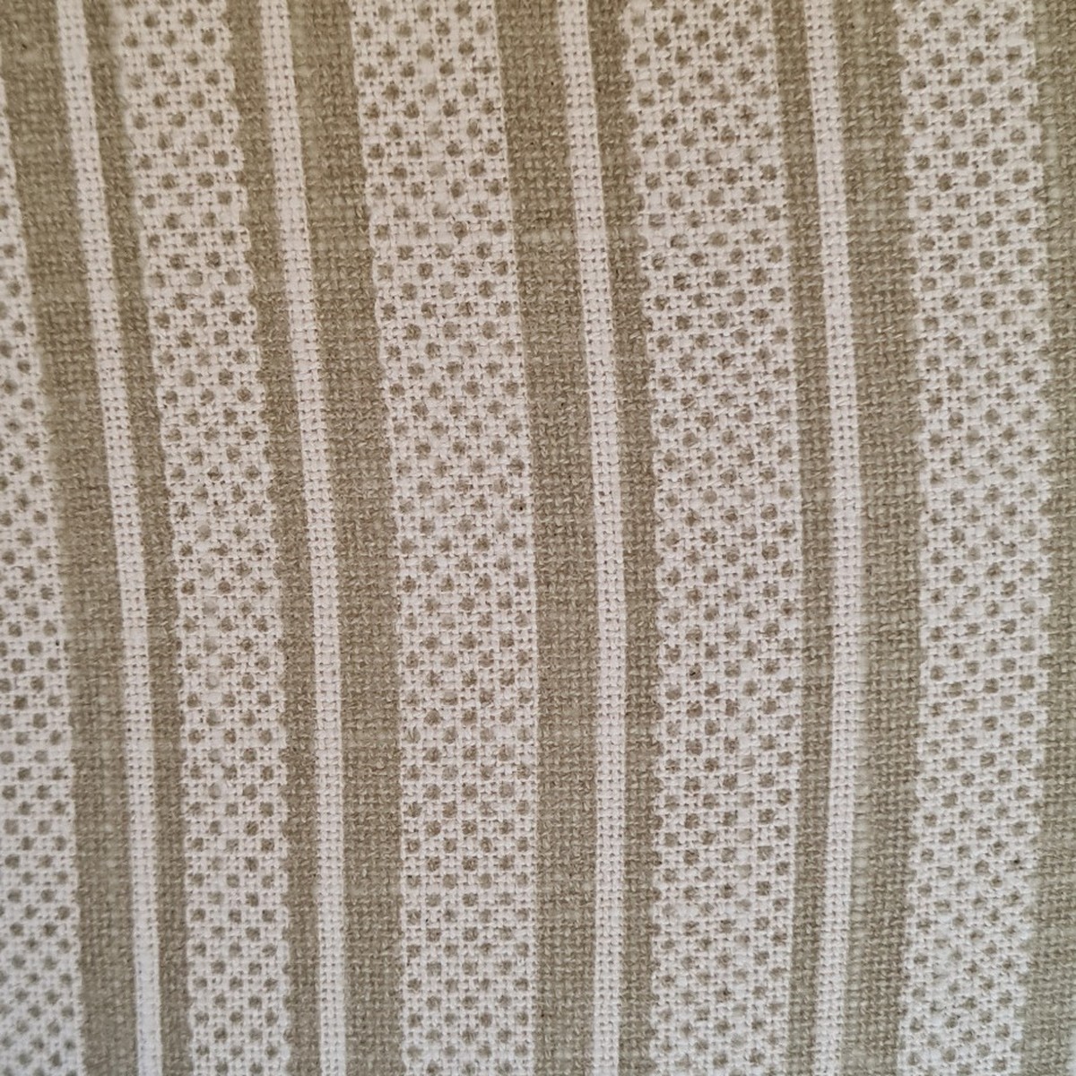 El bordado artesanal destaca sobre un tejido natural, aportando volumen y detalle al cojín. Su parte trasera con diseño de rayas combina perfectamente con el frontal bordado, ofreciendo versatilidad en la decoración.