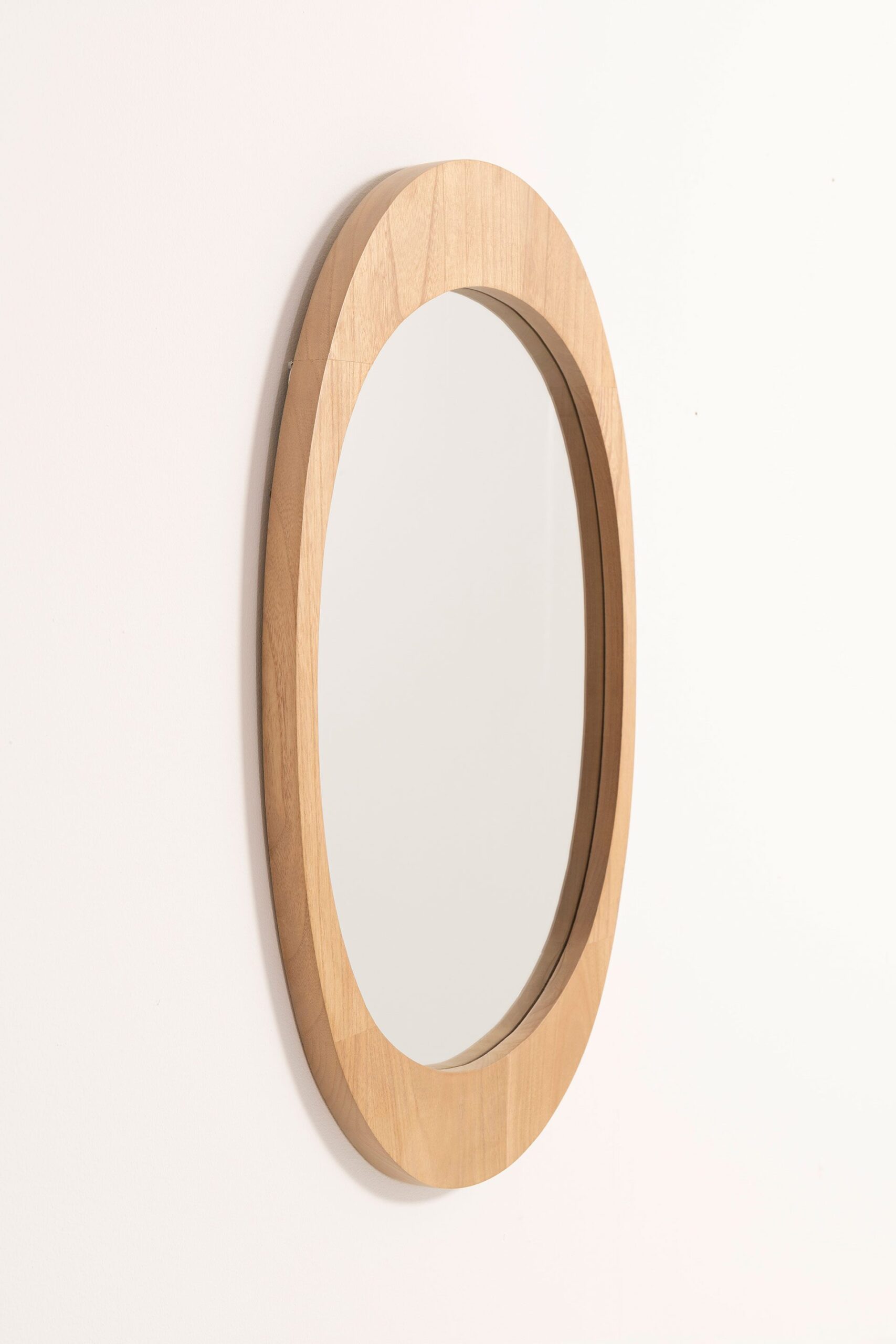 Espejo ovalado de pared en madera natural clara. Diseño elegante y versátil, perfecto para dar amplitud y luminosidad a cualquier espacio.