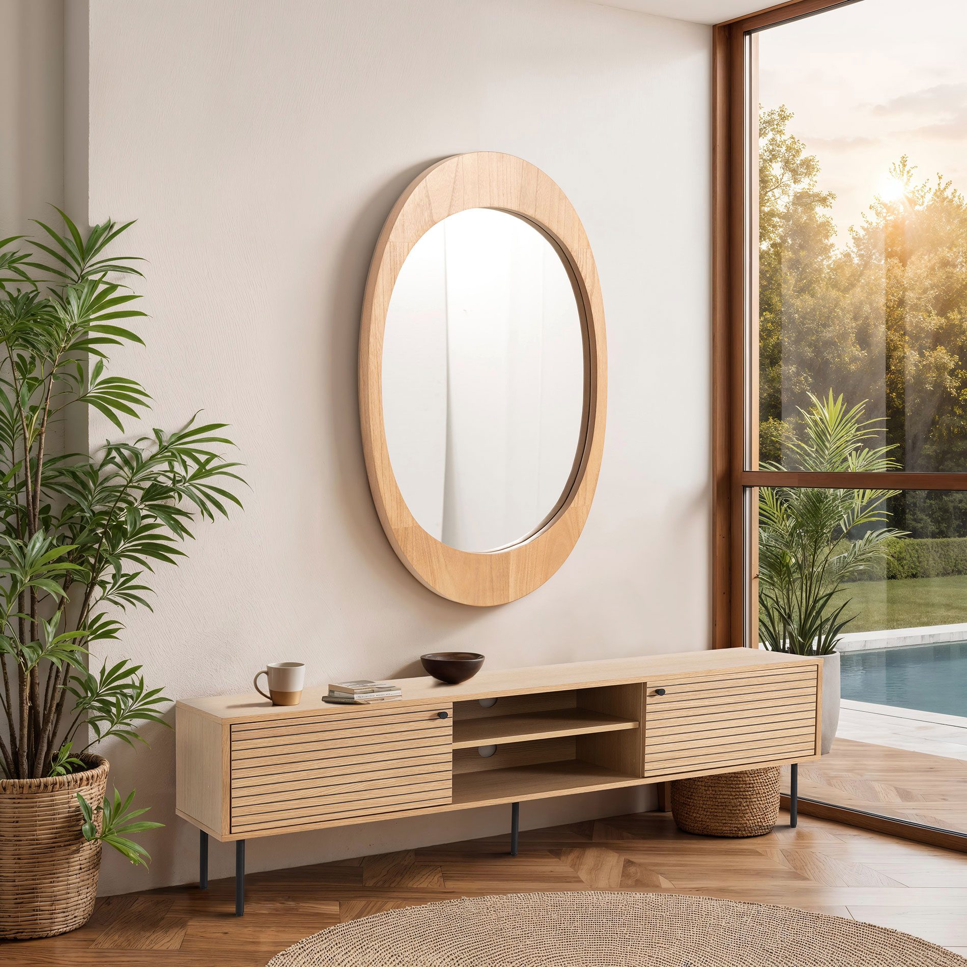 El marco de madera aporta un acabado natural muy actual, ideal para decoraciones de estilo nórdico, mediterráneo o contemporáneo. Su formato ovalado suaviza visualmente los espacios, ayudando a generar sensación de armonía y amplitud.