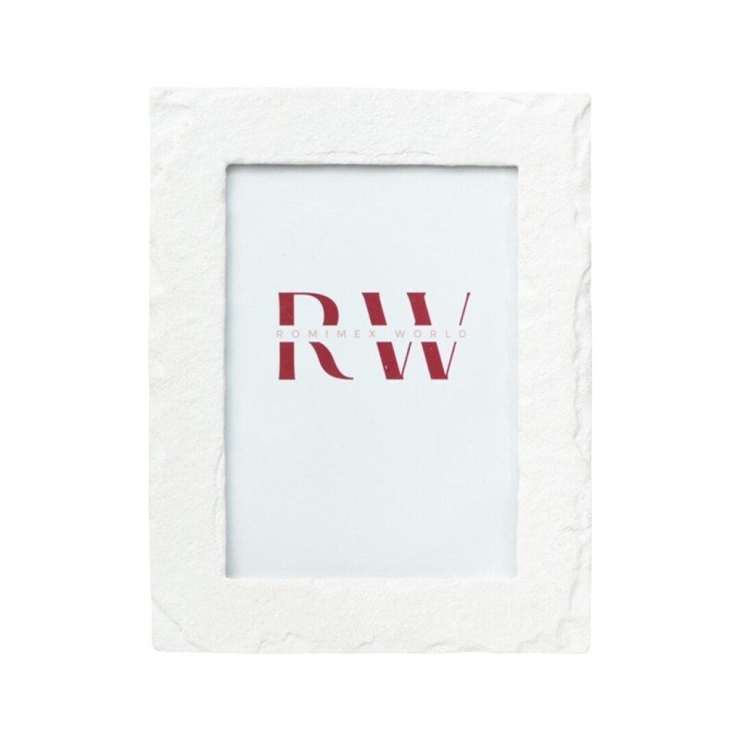 Portafoto decorativo fabricado en resina con acabado blanco texturizado, una pieza versátil que aporta luminosidad y elegancia a cualquier espacio. Su diseño limpio y atemporal permite integrarlo fácilmente en diferentes estilos decorativos, desde ambientes modernos hasta espacios más naturales o clásicos.